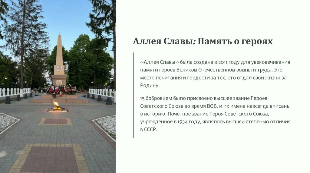 Аллея Славы: Память о героях«Аллея Славы» была создана в 2011 году для увековечивания