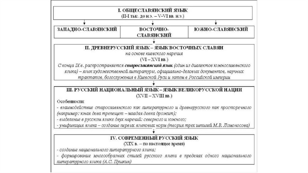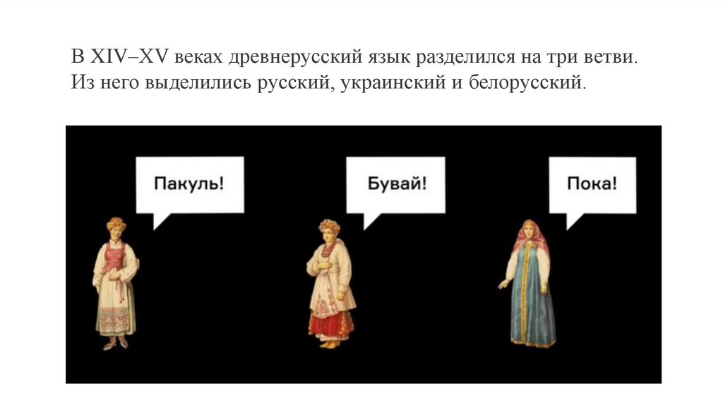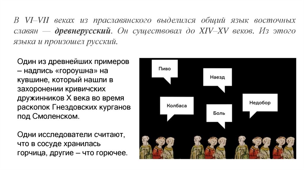 В VI–VII веках из праславянского выделился общий язык восточныхславян — древнерусский. Он существовал до XIV–XV веков. Из этого