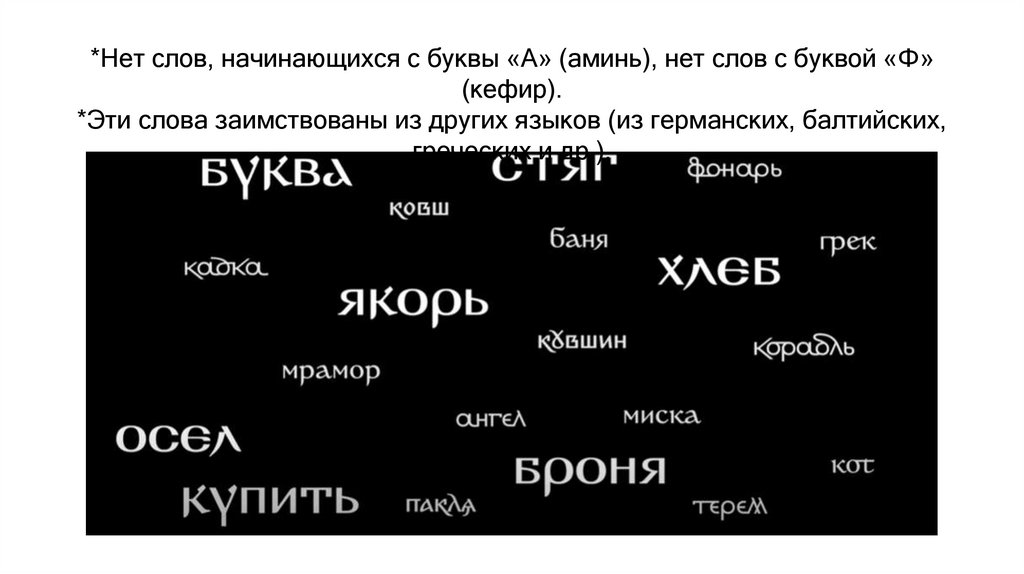 *Нет слов, начинающихся с буквы «А» (аминь), нет слов с буквой «Ф»(кефир).