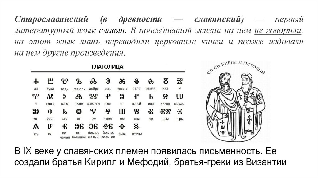 Старославянский (в древности — славянский) — первыйлитературный язык славян. В повседневной жизни на нем не говорили,