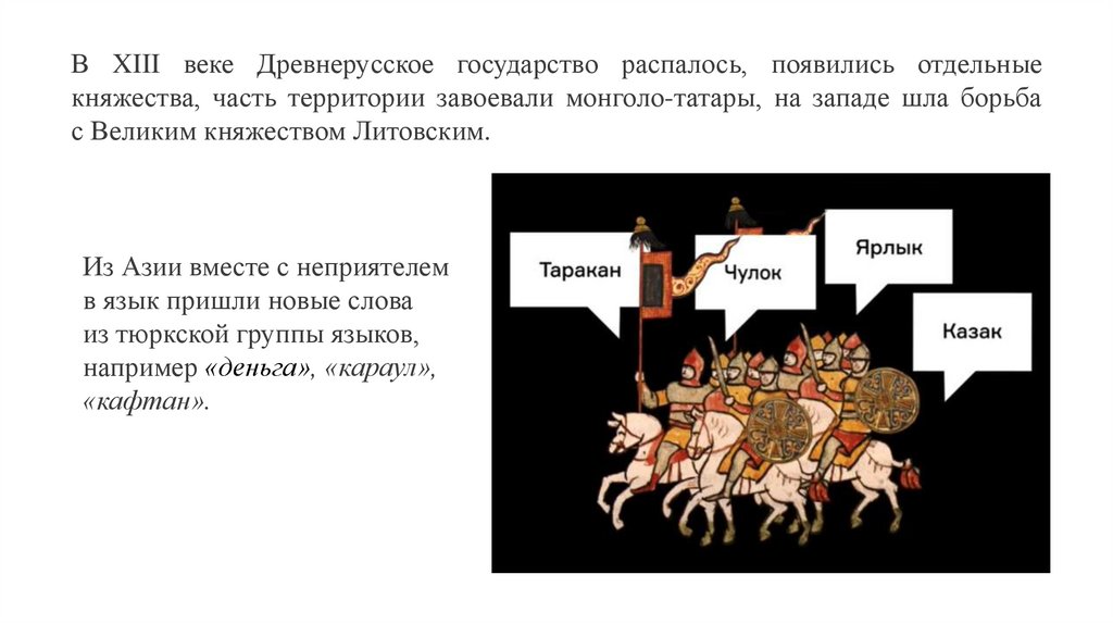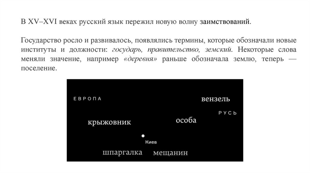 В XV–XVI веках русский язык пережил новую волну заимствований.Государство росло и развивалось, появлялись термины, которые обозначали новые