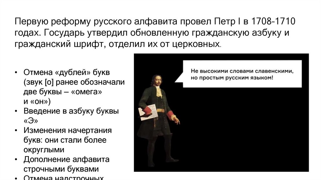 Первую реформу русского алфавита провел Петр I в 1708–1710годах. Государь утвердил обновленную гражданскую азбуку и