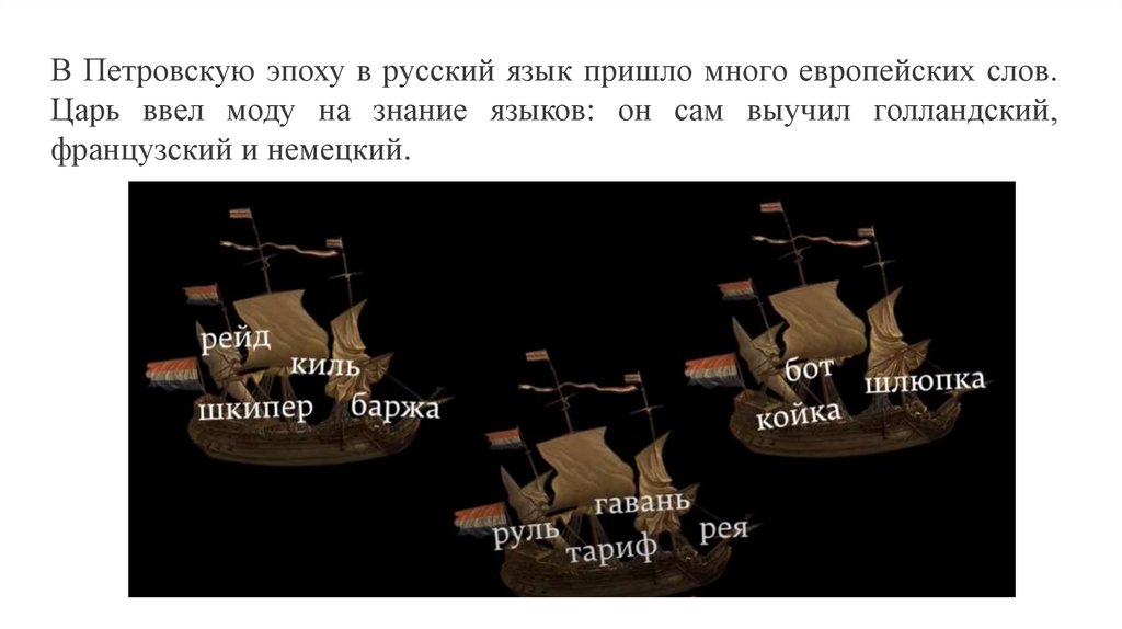 В Петровскую эпоху в русский язык пришло много европейских слов.Царь ввел моду на знание языков: он сам выучил голландский,