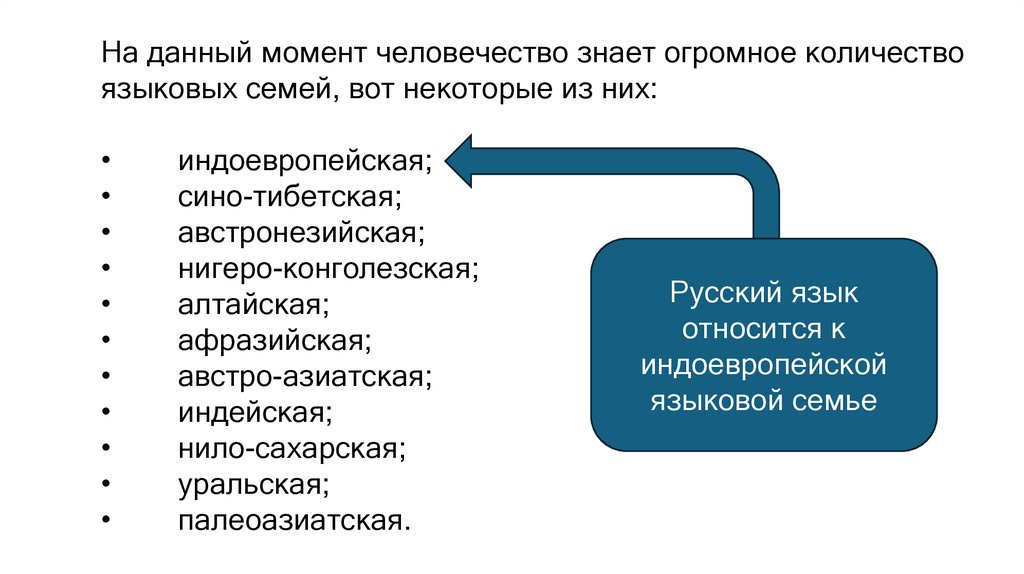 На данный момент человечество знает огромное количествоязыковых семей, вот некоторые из них: