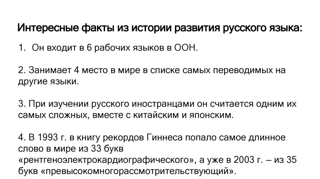 Интересные факты из истории развития русского языка:1. Он входит в 6 рабочих языков в ООН.