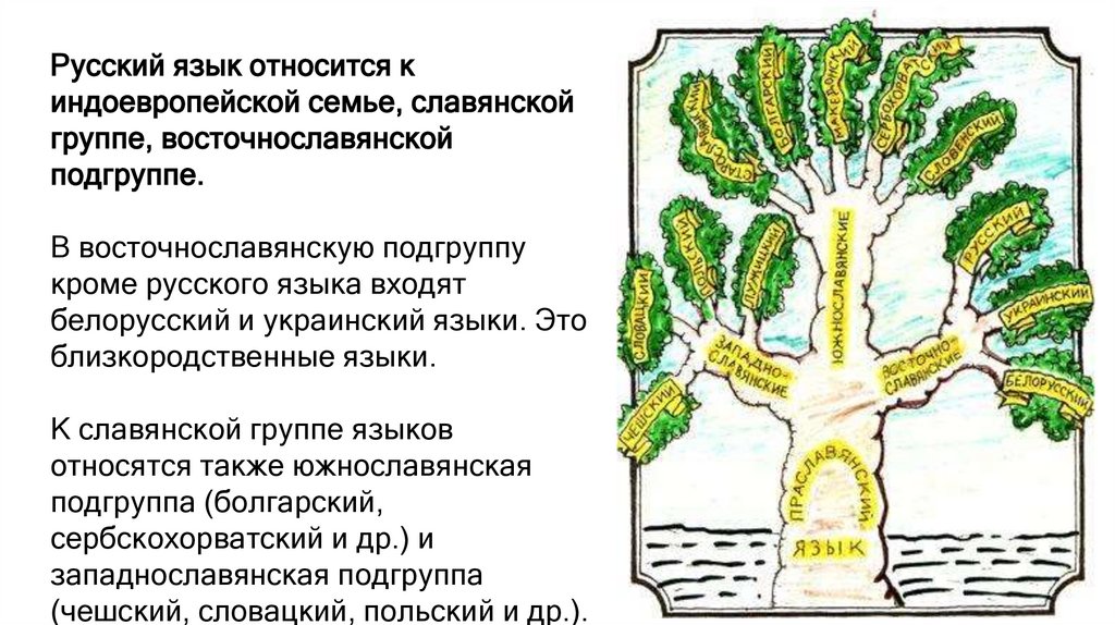 Русский язык относится киндоевропейской семье, славянской