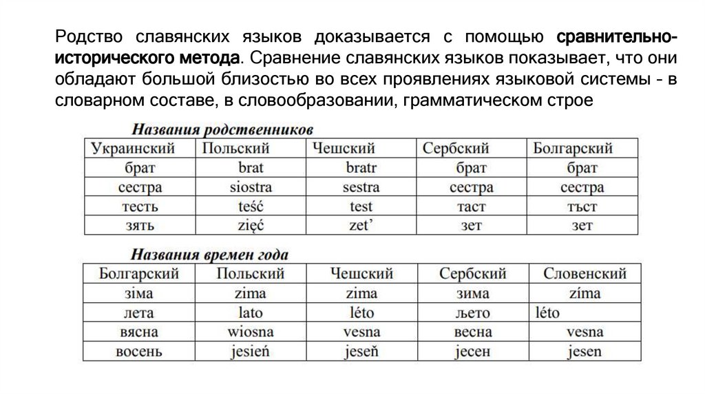 Родство славянских языков доказывается с помощью сравнительноисторического метода. Сравнение славянских языков показывает, что ониобладают большой близостью во всех проявлениях языковой системы – в