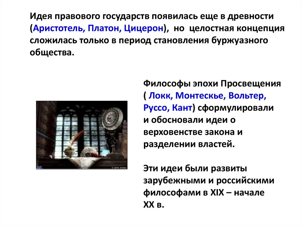 Идея правового государств появилась еще в древности(Аристотель, Платон, Цицерон), но целостная концепция