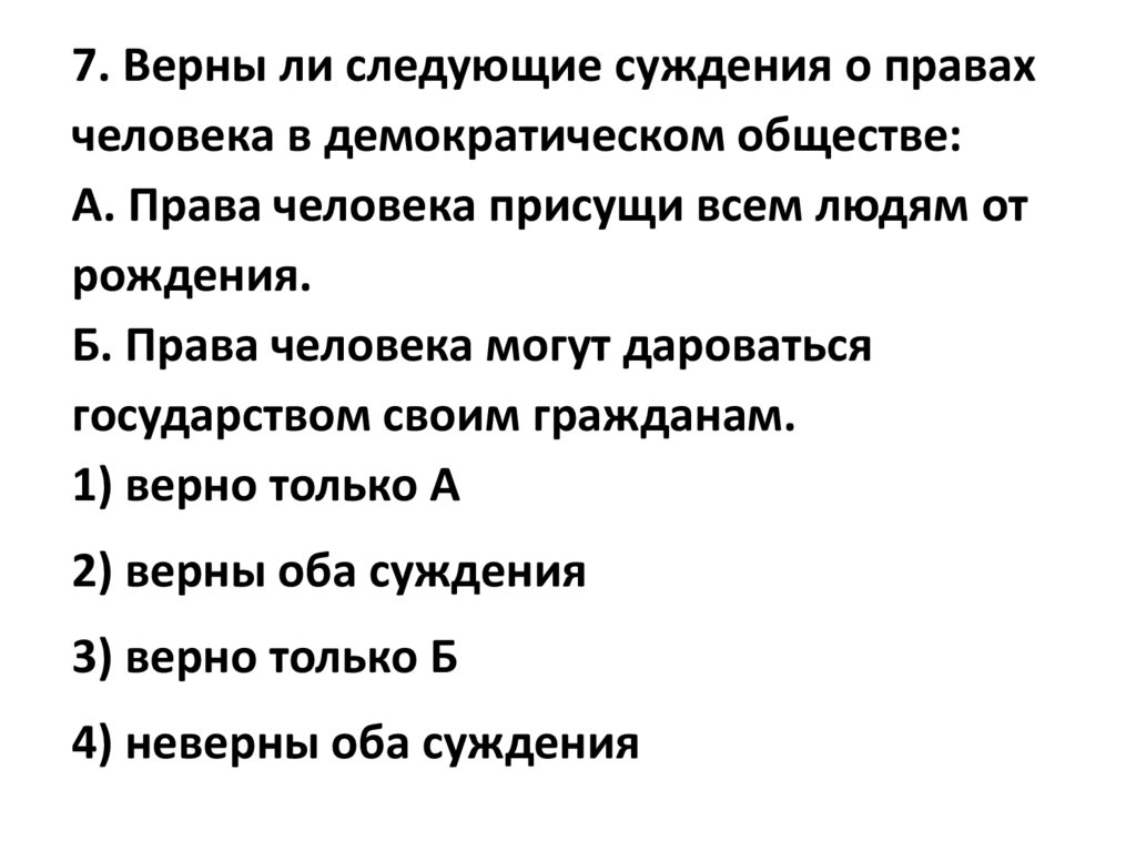 7. Верны ли следующие суждения о правахчеловека в демократическом обществе: