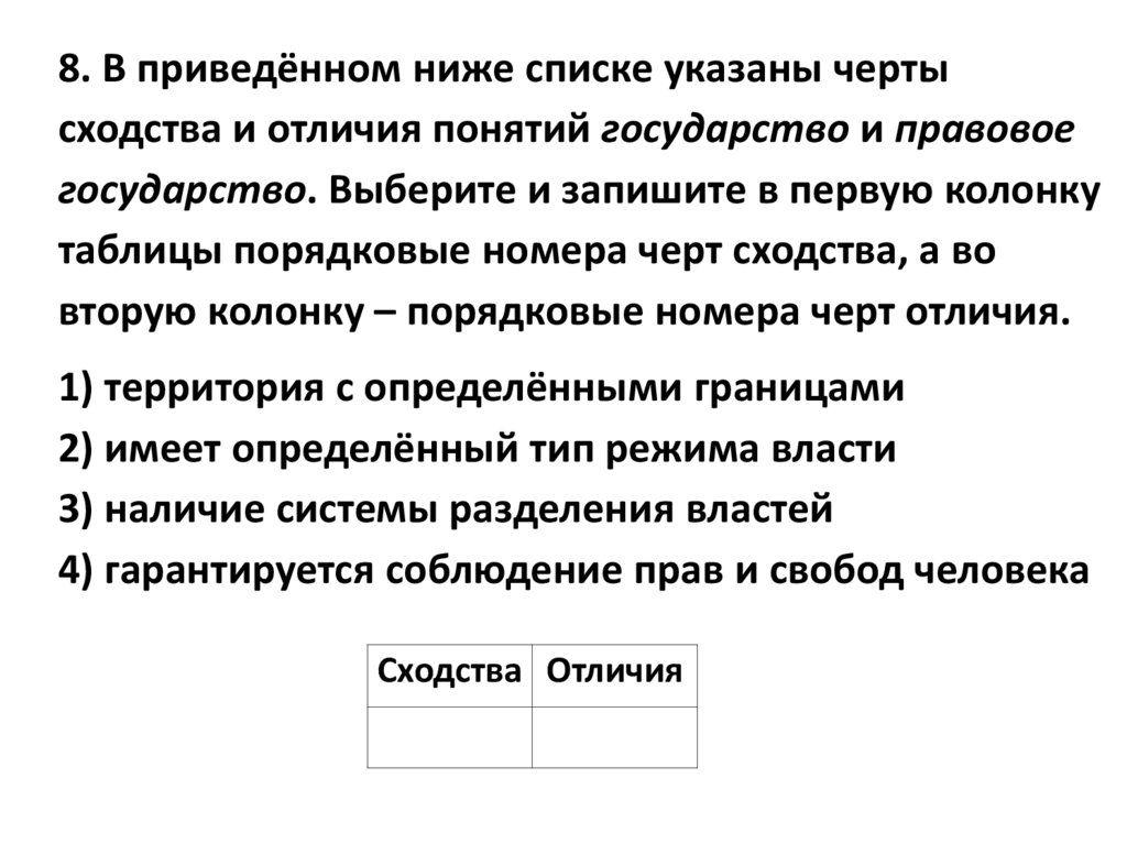 8. В приведённом ниже списке указаны чертысходства и отличия понятий государство и правовое