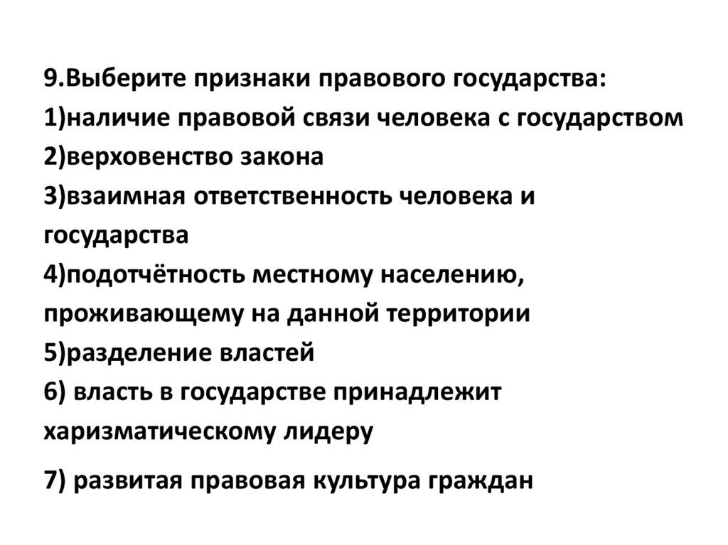 9.Выберите признаки правового государства:1)наличие правовой связи человека с государством