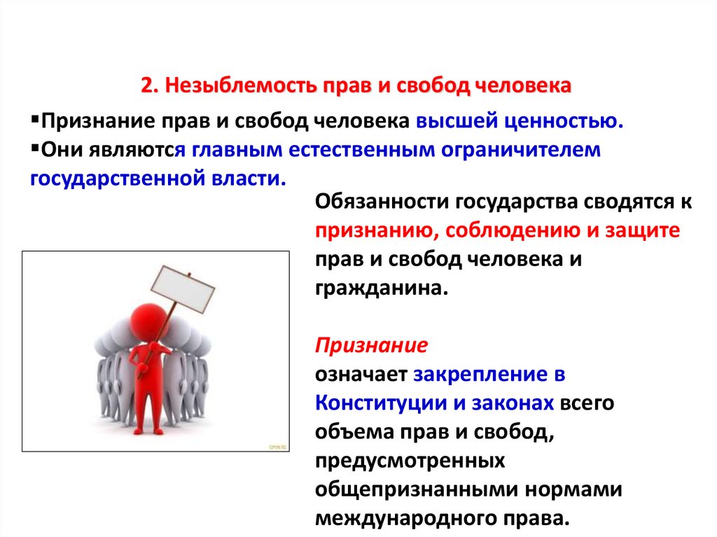 2. Незыблемость прав и свобод человекаПризнание прав и свобод человека высшей ценностью.