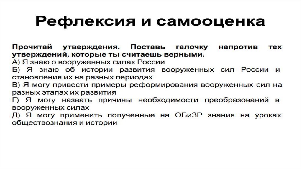 • иметь представление об истории зарождения и развития Вооруженных СилРоссийской Федерации;