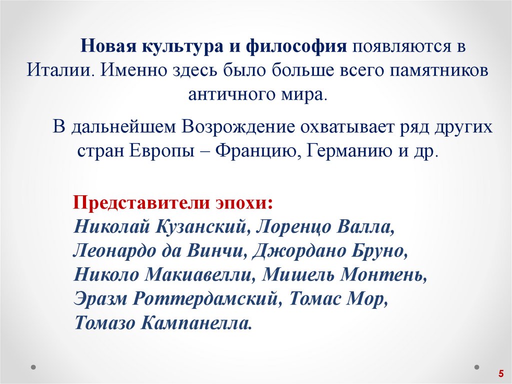 Новая культура и философия появляются вИталии. Именно здесь было больше всего памятников