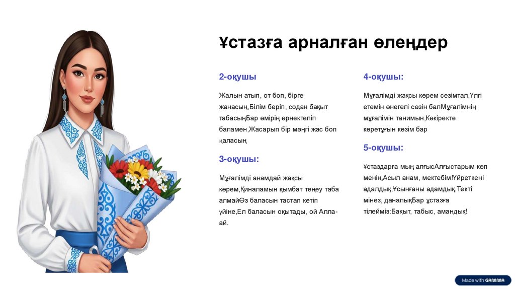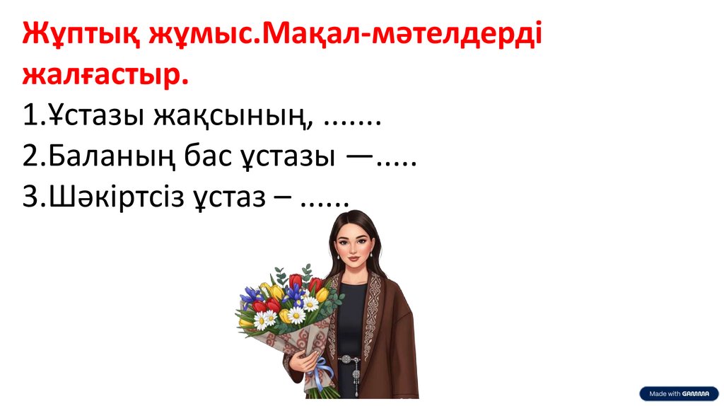 Жеке жұмысТапсырма: «Ұстазға тілегім» ұстазға деген өлеңшумақтарын оқу.