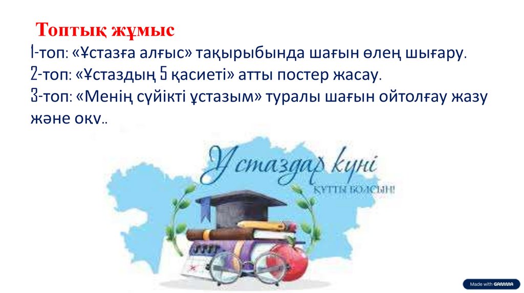 Топтық жұмыс1-топ: «Ұстазға алғыс» тақырыбында шағын өлең шығару.