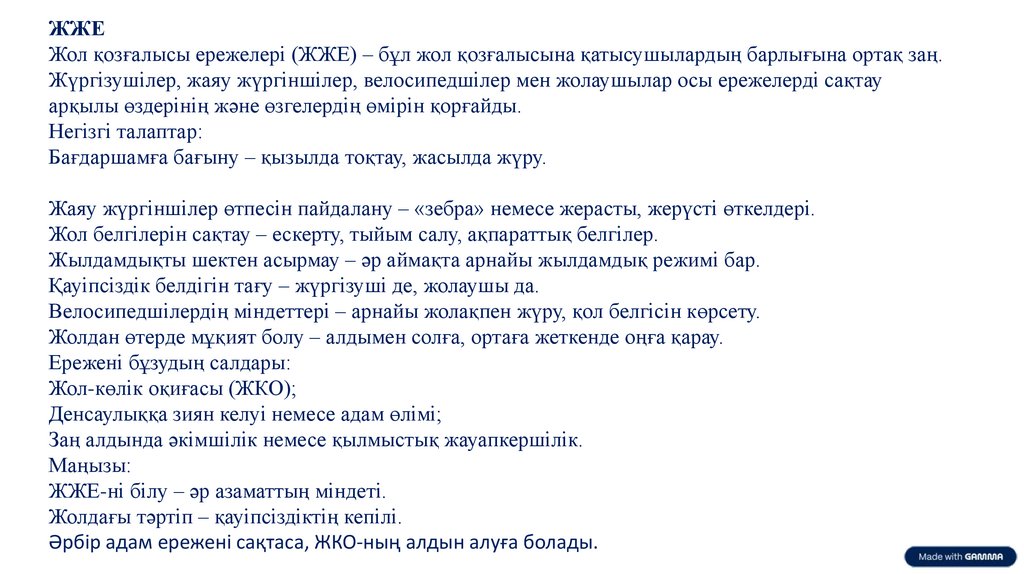 ЖЖЕЖол қозғалысы ережелері (ЖЖЕ) – бұл жол қозғалысына қатысушылардың барлығына ортақ заң.