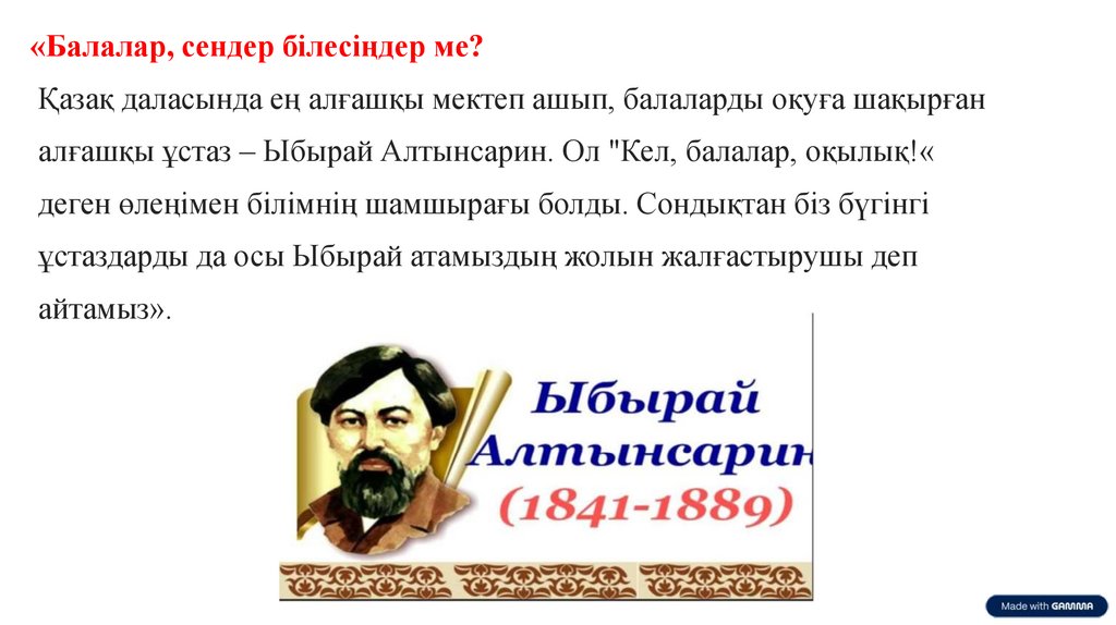 алғашқы ұстаз – Ыбырай Алтынсарин. Ол "Кел, балалар, оқылық!«