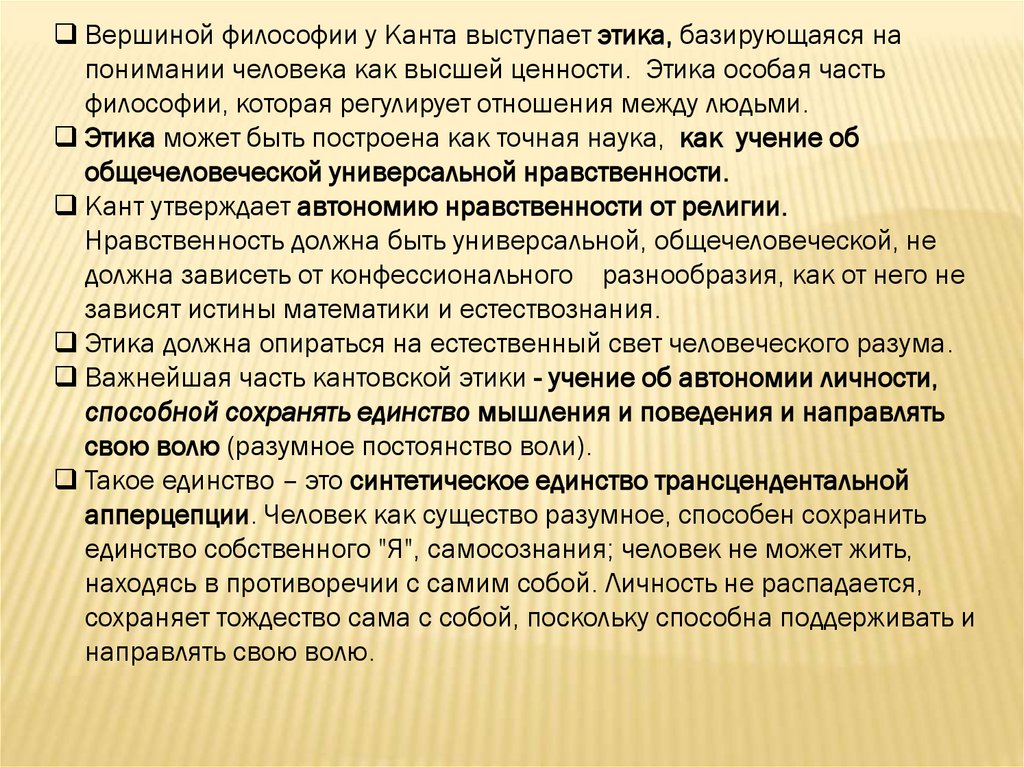 Вершиной философии у Канта выступает этика, базирующаяся напонимании человека как высшей ценности. Этика особая часть