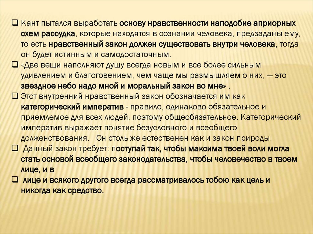 Кант пытался выработать основу нравственности наподобие априорныхсхем рассудка, которые находятся в сознании человека, предзаданы ему,