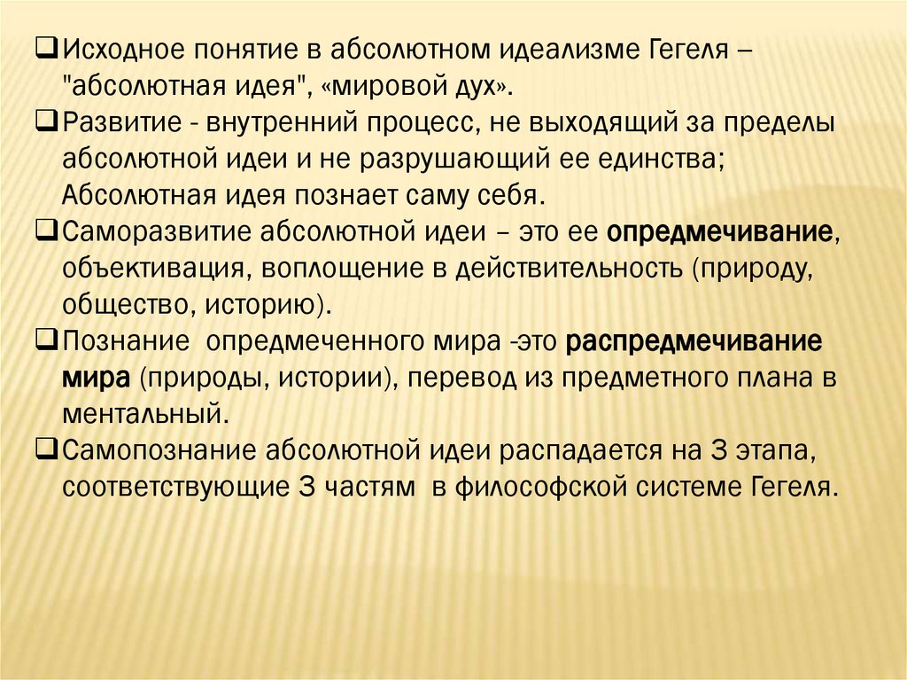 Исходное понятие в абсолютном идеализме Гегеля -"абсолютная идея", «мировой дух».Развитие - внутренний процесс, не выходящий за пределы