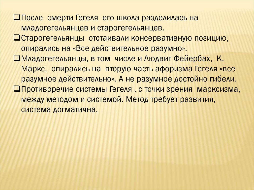 После смерти Гегеля его школа разделилась намладогегельянцев и старогегельянцев.