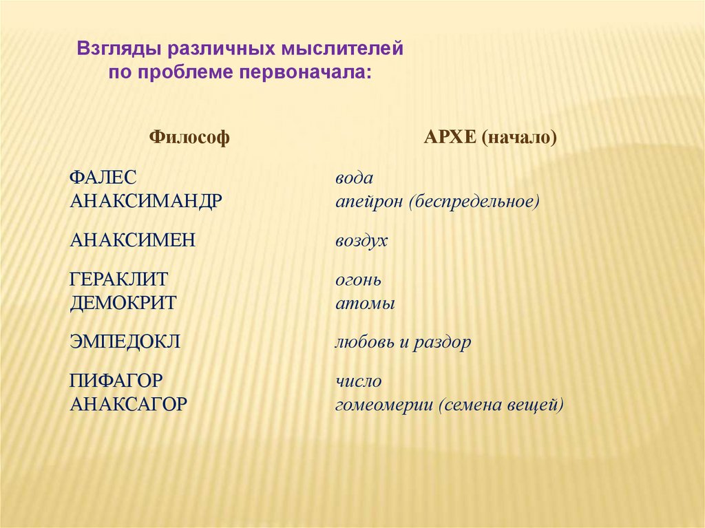 школы,Пифагор, Гераклит, Демокрит и др.;