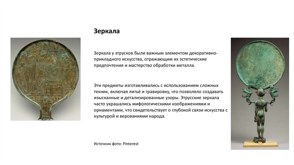 ЗеркалаЗеркала у этрусков были важным элементом декоративноприкладного искусства, отражающим их эстетические