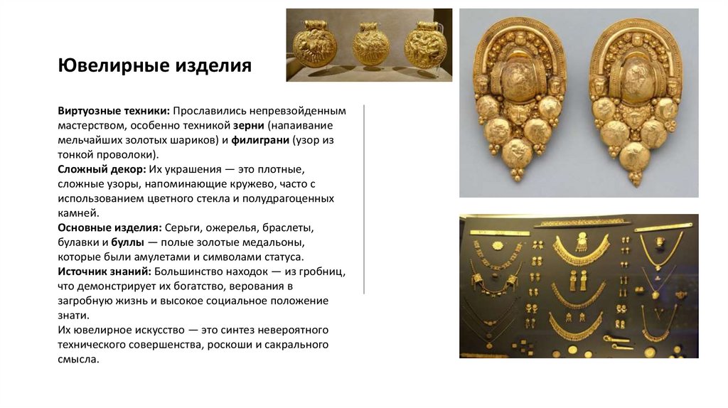 элементов, включая филигрань и зернь. Этруски использовали широкий спектр материалов и