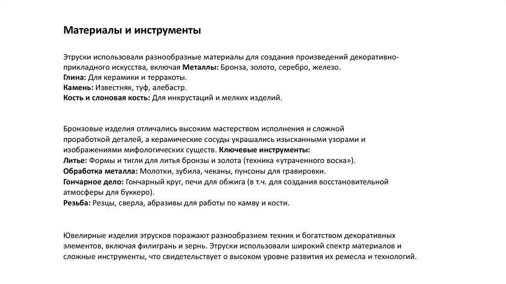 Материалы и инструментыЭтруски использовали разнообразные материалы для создания произведений декоративноприкладного искусства, включая Металлы: Бронза, золото, серебро, железо.