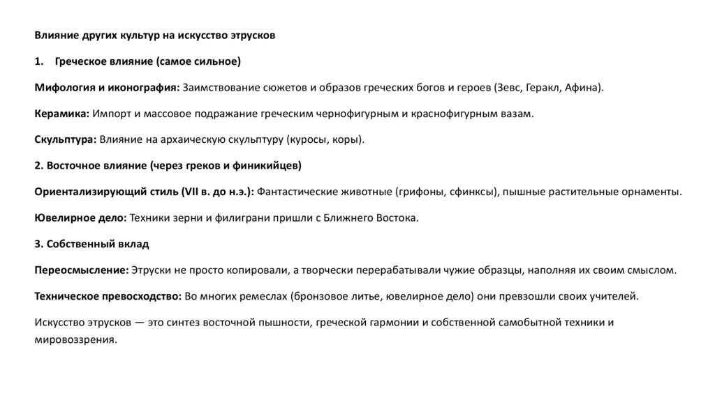 Влияние других культур на искусство этрусков1. Греческое влияние (самое сильное)
