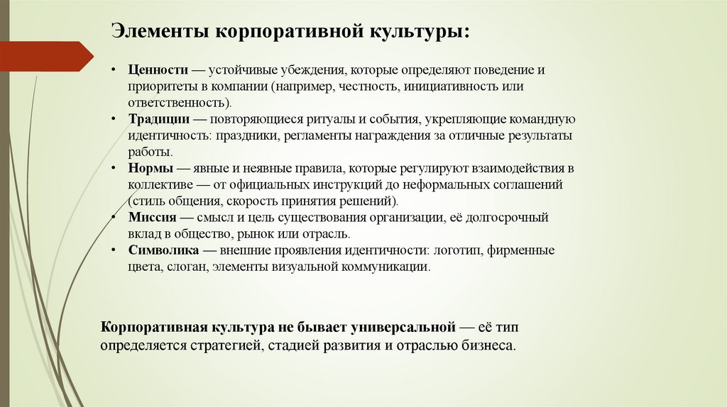Элементы корпоративной культуры:• Ценности — устойчивые убеждения, которые определяют поведение и