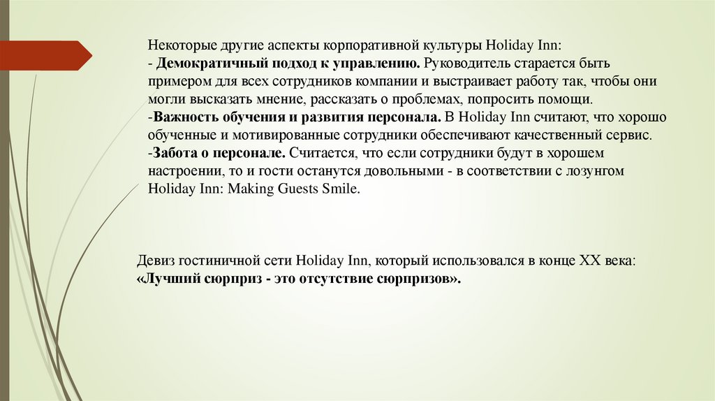 Некоторые другие аспекты корпоративной культуры Holiday Inn:- Демократичный подход к управлению. Руководитель старается быть