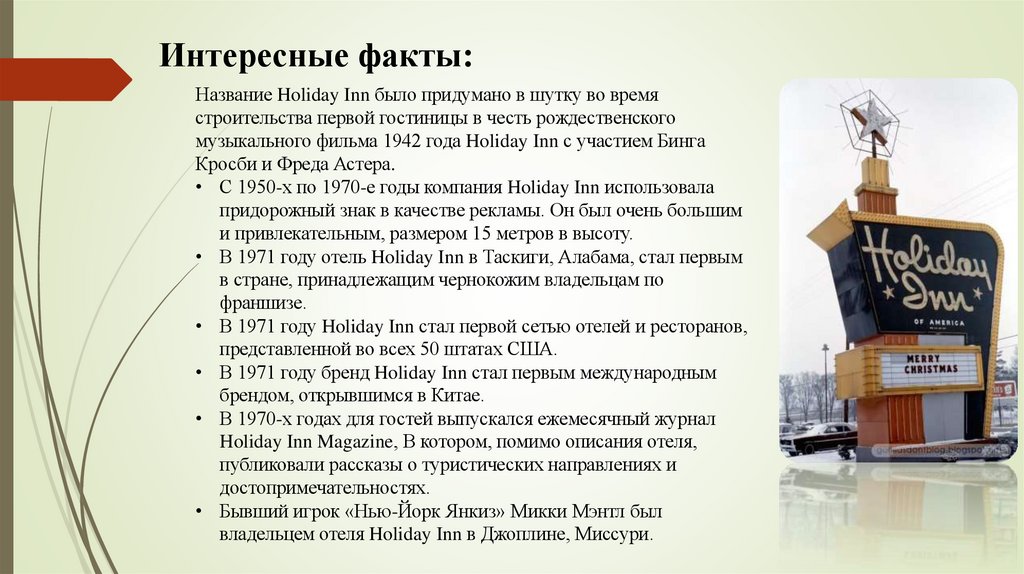 Интересные факты:Название Holiday Inn было придумано в шутку во время