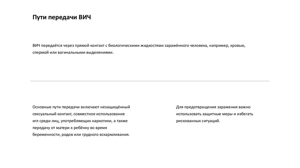 Пути передачи ВИЧВИЧ передаётся через прямой контакт с биологическими жидкостями заражённого человека, например, кровью,