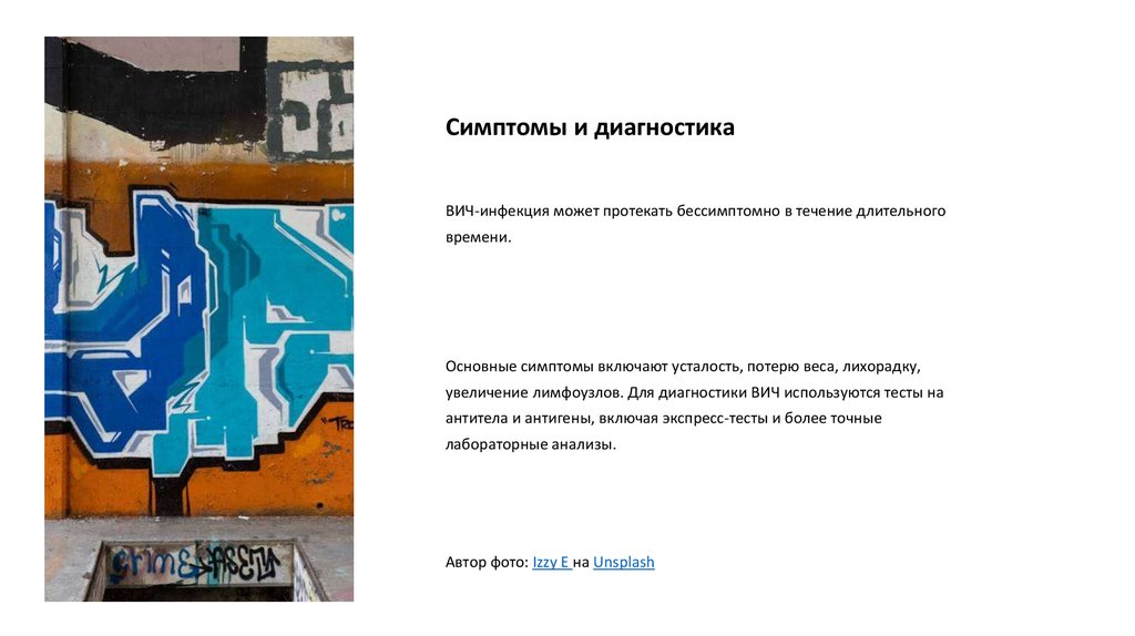 Симптомы и диагностикаВИЧ-инфекция может протекать бессимптомно в течение длительного