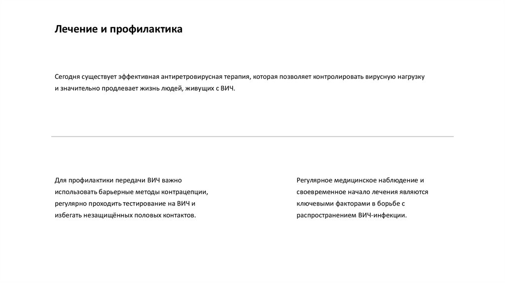 Лечение и профилактикаСегодня существует эффективная антиретровирусная терапия, которая позволяет контролировать вирусную нагрузку