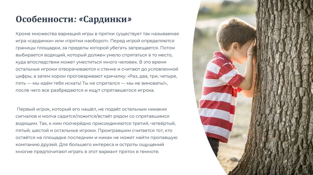 Особенности: «Сардинки»Кроме множества вариаций игры в прятки существует так называемая