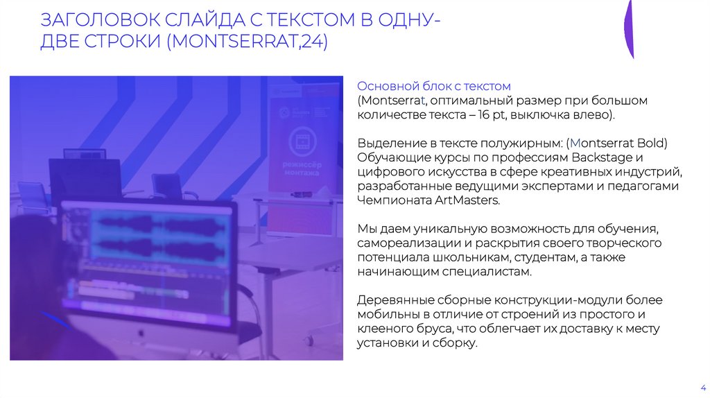 Выделение в тексте полужирным: (Montserrat Bold) Обучающие курсы по профессиям Backstage и цифрового искусства в сфере