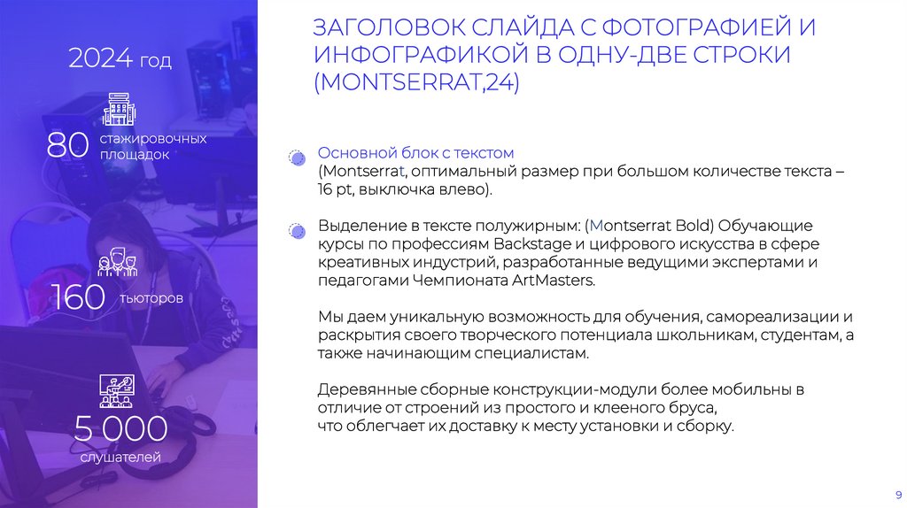 (Montserrat, оптимальный размер при большом количестве текста – 12 pt, выключка влево).
