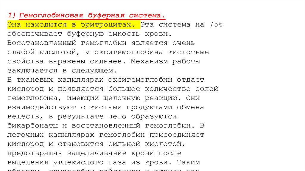 1) Гемоглобиновая буферная система.Она находится в эритроцитах. Эта система на 75%