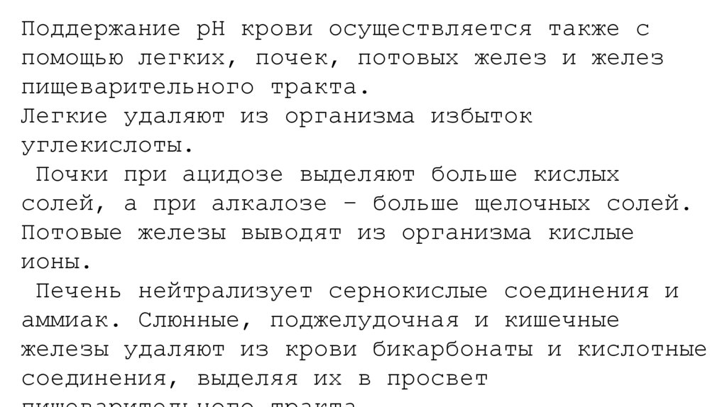 Поддержание рН крови осуществляется также спомощью легких, почек, потовых желез и желез