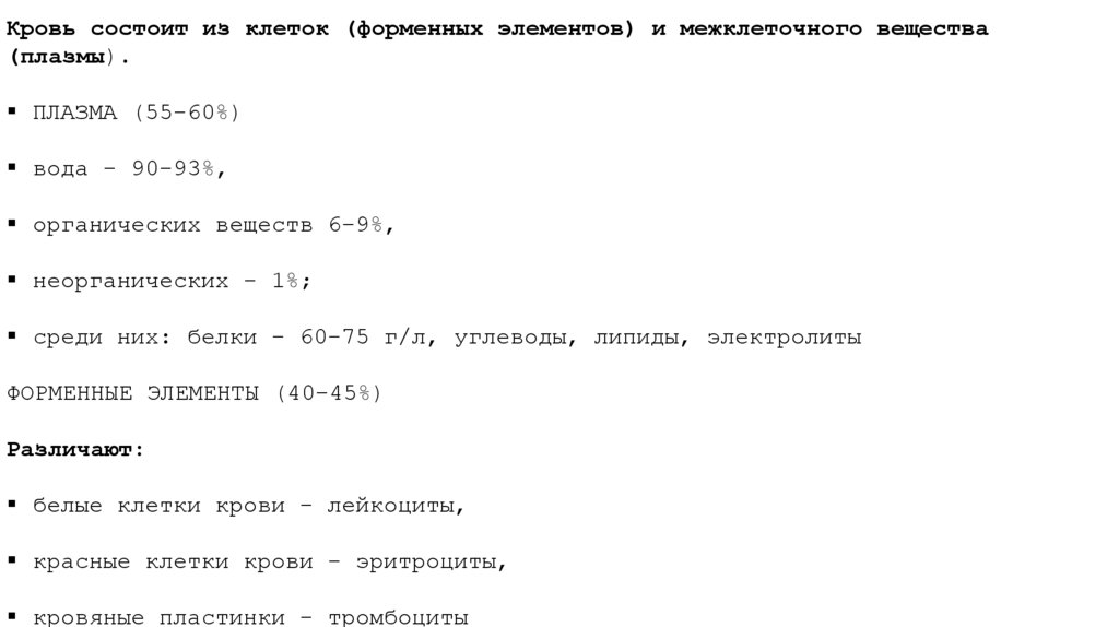 Кровь состоит из клеток (форменных элементов) и межклеточного вещества(плазмы).