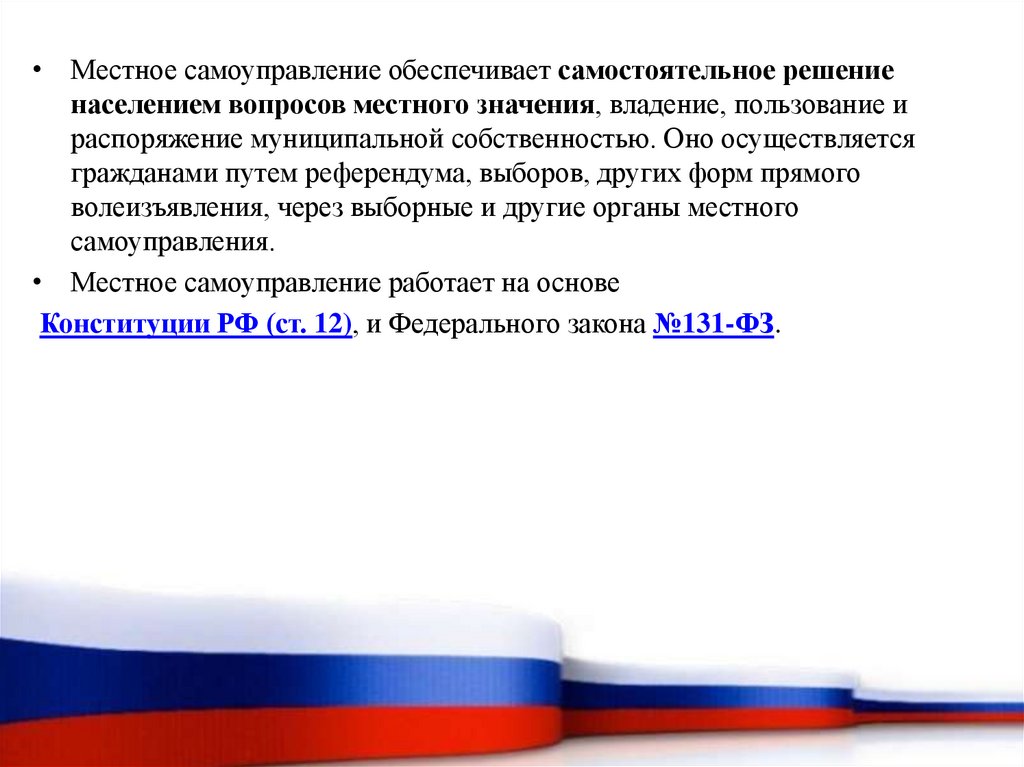 • Местное самоуправление обеспечивает самостоятельное решениенаселением вопросов местного значения, владение, пользование и