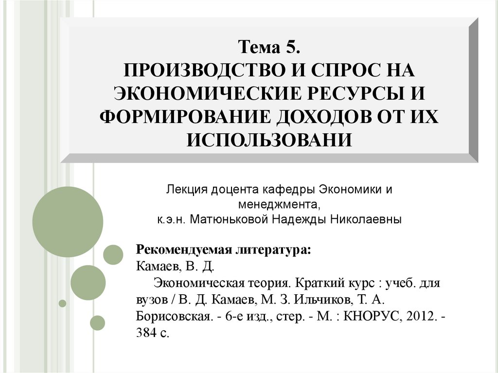 1. Тема 5. ПРОИЗВОДСТВО И СПРОС НА ЭКОНОМИЧЕСКИЕ РЕСУРСЫ И ФОРМИРОВАНИЕ ДОХОДОВ ОТ ИХ ИСПОЛЬЗОВАНИ