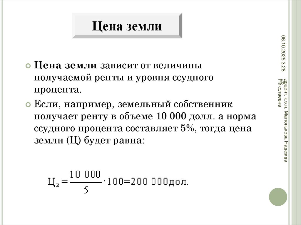 Цена землидоцент, к.э.н. Матюнькова Надежда