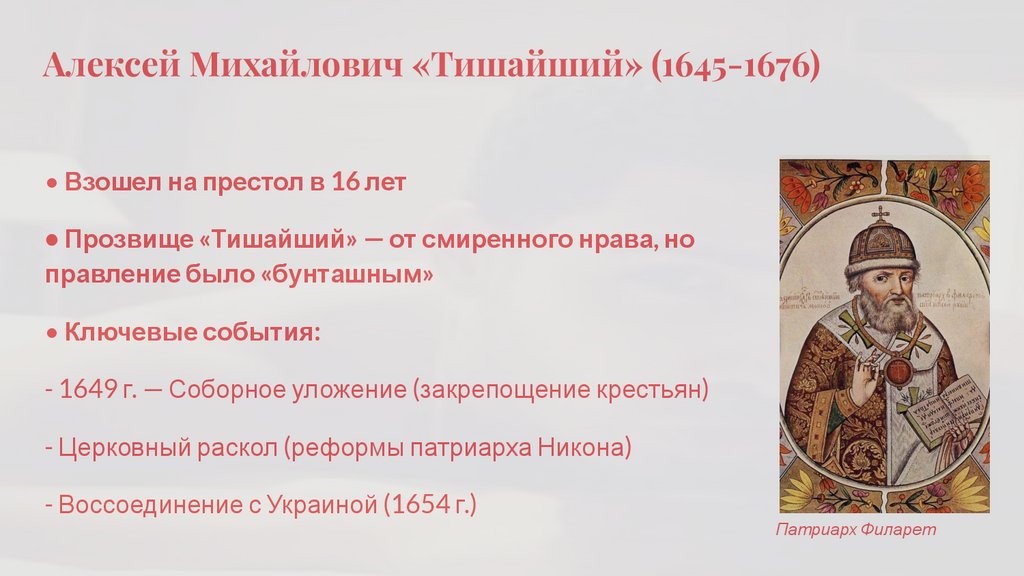 Алексей Михайлович «Тишайший» (1645-1676)• Взошел на престол в 16 лет