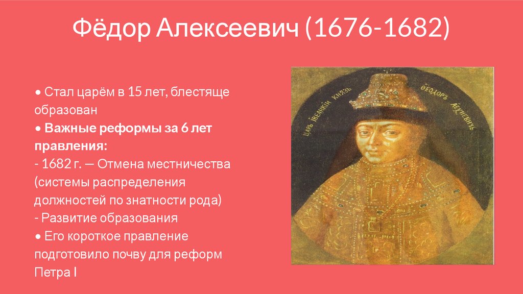 Фёдор Алексеевич (1676-1682)• Стал царём в 15 лет, блестяще