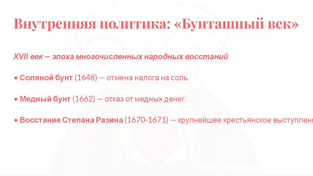 Внутренняя политика: «Бунташный век»XVII век — эпоха многочисленных народных восстаний
