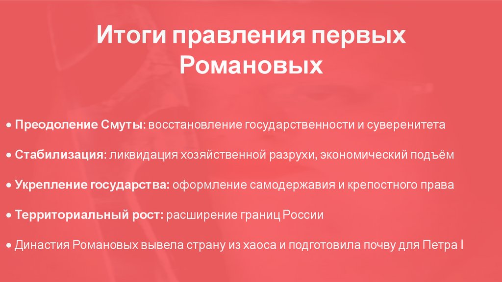 • Династия Романовых вывела страну из хаоса и подготовила почву для Петра I
